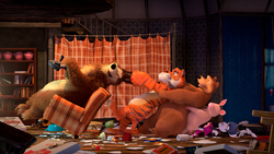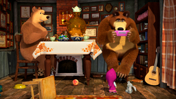 Spielwahnwitz. Der Bär nimmt Mascha und dem Hasen ihre Spielekonsole ab und verfällt umgehend in den totalen Spielewahn. Weder die Wölfe noch all seine Freunde können ihm helfen. Die Zeit vergeht, der Garten verwildert und die Bärin ist mittlerweile leiert und Mutter. Ein Schock für den Bären. Endlich erwacht er aus seiner Spielsucht und stellt erleichtert fest, dass es nur ein Traum war
